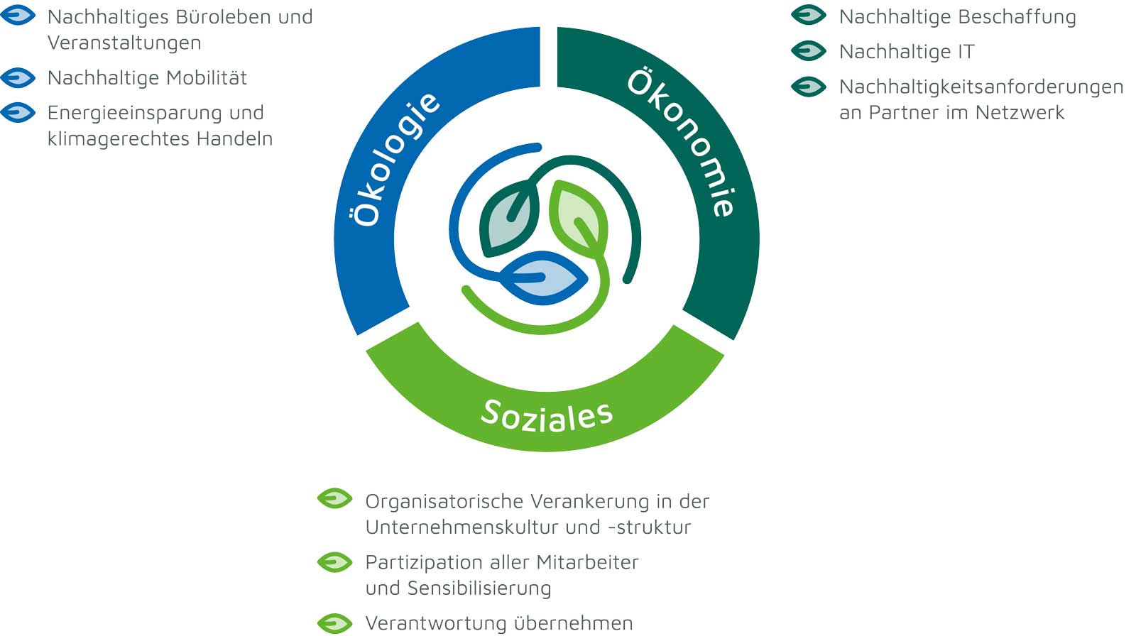 Wir schärfen das Bewusstsein unserer Teammitglieder für die Wichtigkeit eines nachhaltigen Umgangs mit natürlichen Ressourcen. Auch von unseren Kunden und Partnern erwarten wir eine ressourcen- und umweltschonende Erbringung ihrer Leistungen. Wir ziehen die Vermeidung von Abfällen der Wiederverwertung vor.