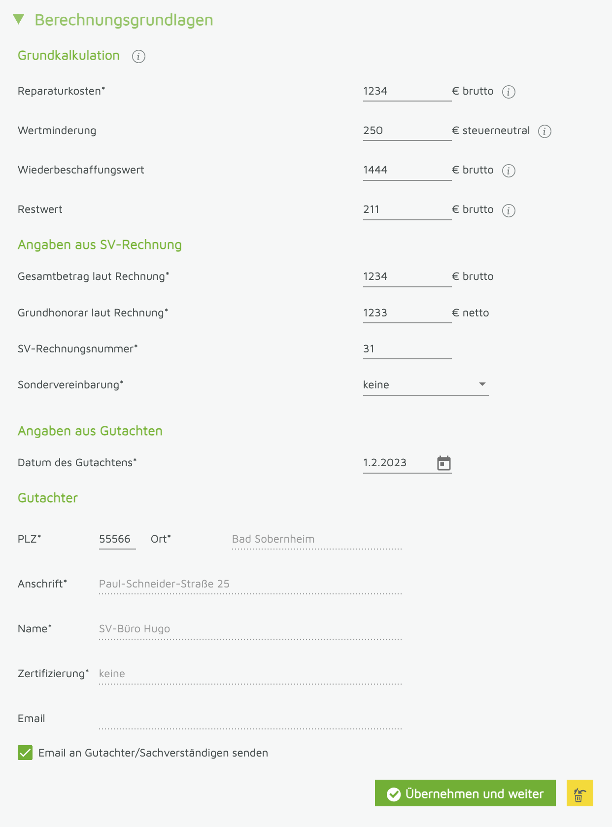 Folgende Informationen sind aus der Sachverständigenrechnung zu übernehmen: Gesamtbetrag der Rechnung als Bruttowert, Grundhonorar netto und die Postleitzahl des SV-Büros. Der Gesamtbetrag der Rechnung (Bruttobetrag) ist aus statistischen Gründen und zur Darstellung der Differenzbeträge im Prüfbericht einzugeben.