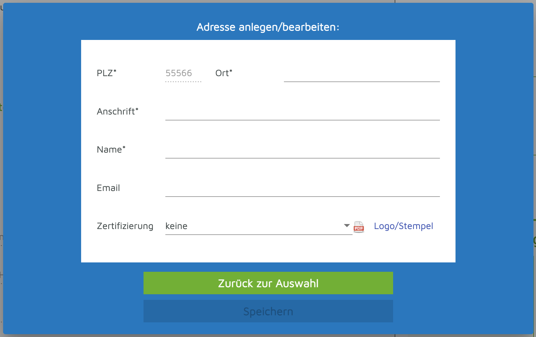 Das SV-Büro kann entweder direkt angewählt oder über „Neue Adresse anlegen“ neu erfasst werden, falls es noch nicht vorhanden ist. Pflichtfelder sind entsprechend mit * gekennzeichnet.