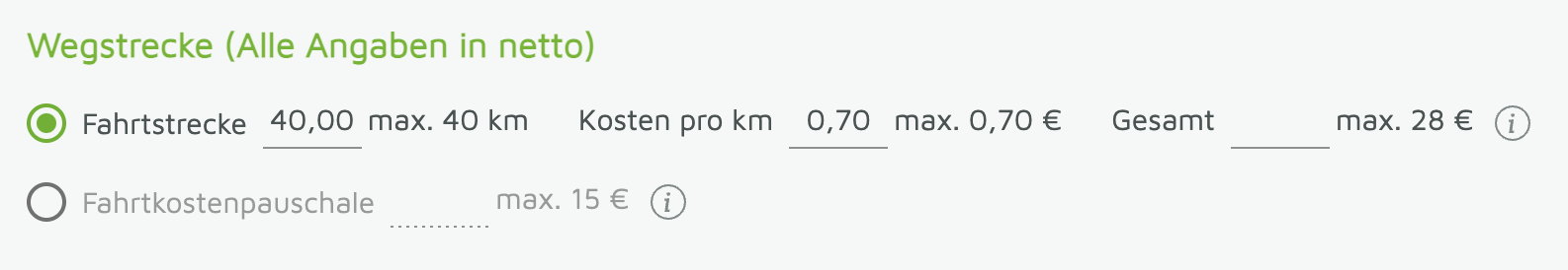 Die Angaben zur Fahrtstrecke sind hier gemäß der Sachverständigenrechnung einzutragen – entweder konkret (km und €) oder als Fahrtkostenpauschale. Das System berücksichtigt die maximal erstattungsfähigen Werte und korrigiert gegebenenfalls die Eingaben.