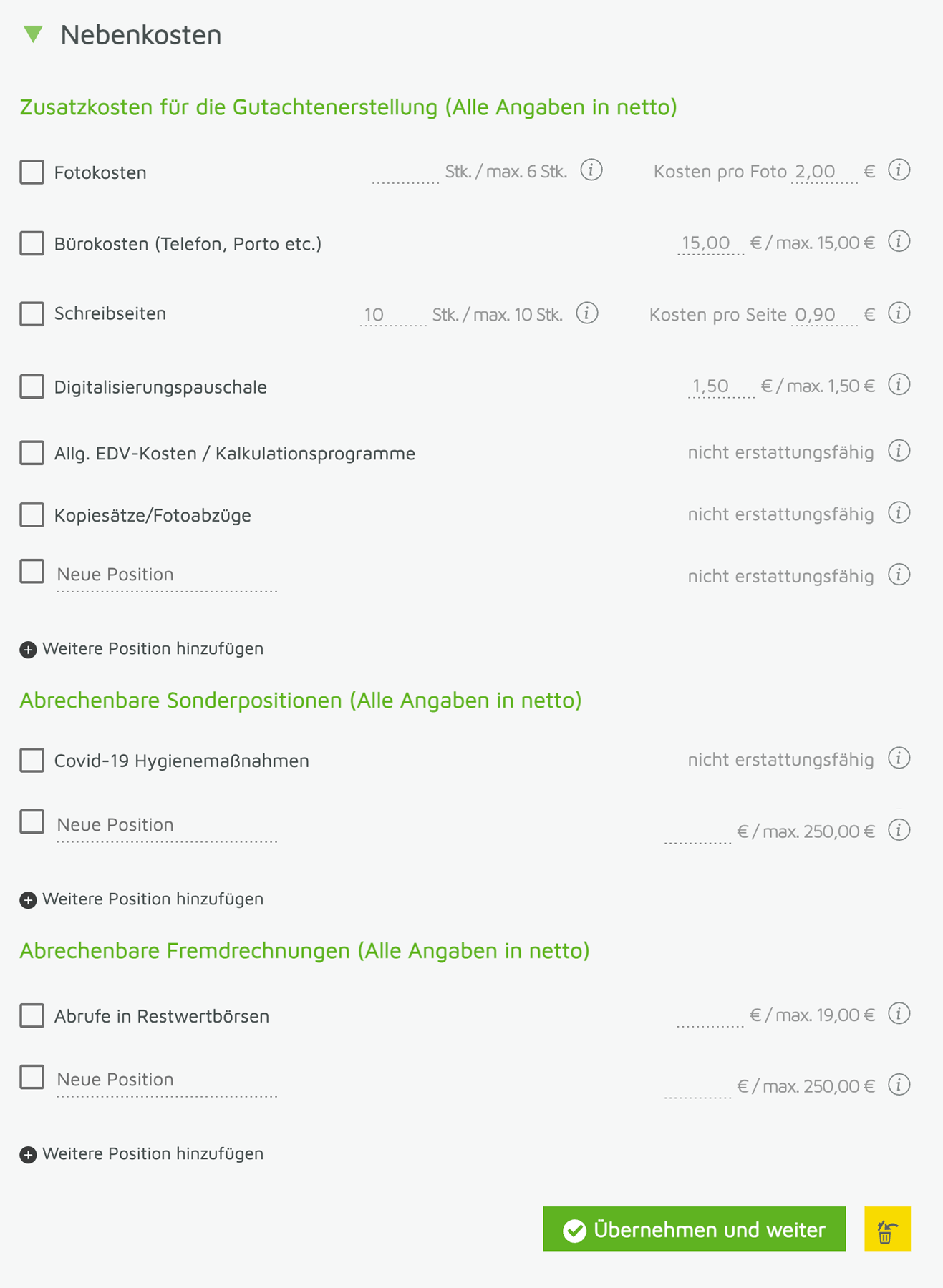 Alle aufgeführten Nebenkosten sind mit der Mengenangabe und/oder Kostenhöhe aus der Sachverständigenrechnung zu übernehmen. Die Positionen, die nicht in der Sachverständigenrechnung enthalten, aber vom System vorgegebenen sind, erfordern keine Werteeintragung.
