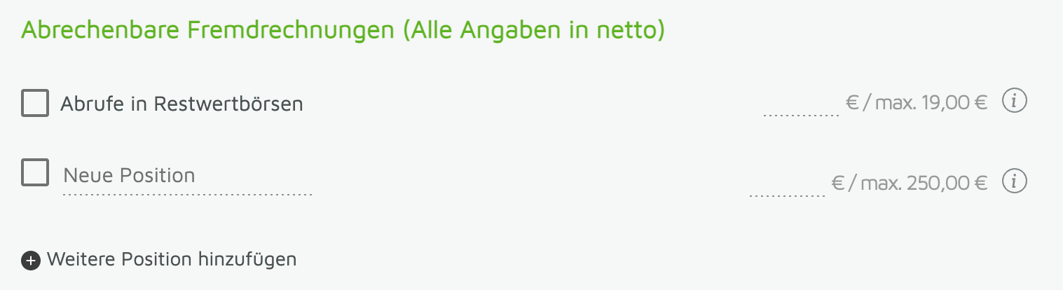 Weitere erstattungsfähige Fremdkosten müssen mit dem Nettobetrag und einer kurzen Beschreibung eingetragen werden. Durch Betätigen des kleinen „+ Weitere Position hinzufügen“-Buttons können neue Positionen erstellt werden, um eine Mehrfachverwendung zu ermöglichen.