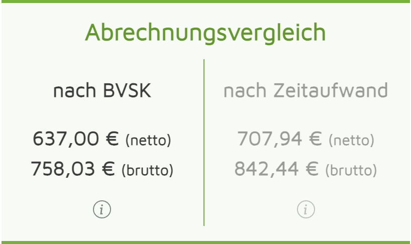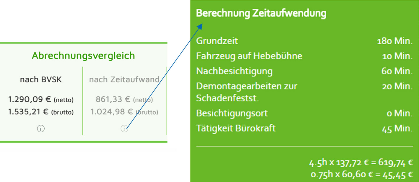 Um die Zeitaufwandsermittlung-Ermittlung transparenter zu gestalten oder zu erklären, besteht die Möglichkeit, über das Info-Icon unter dem Abrechnungsvergleich die Berechnung des Zeitaufwands sowie die verwendeten Stundensätze einzusehen.