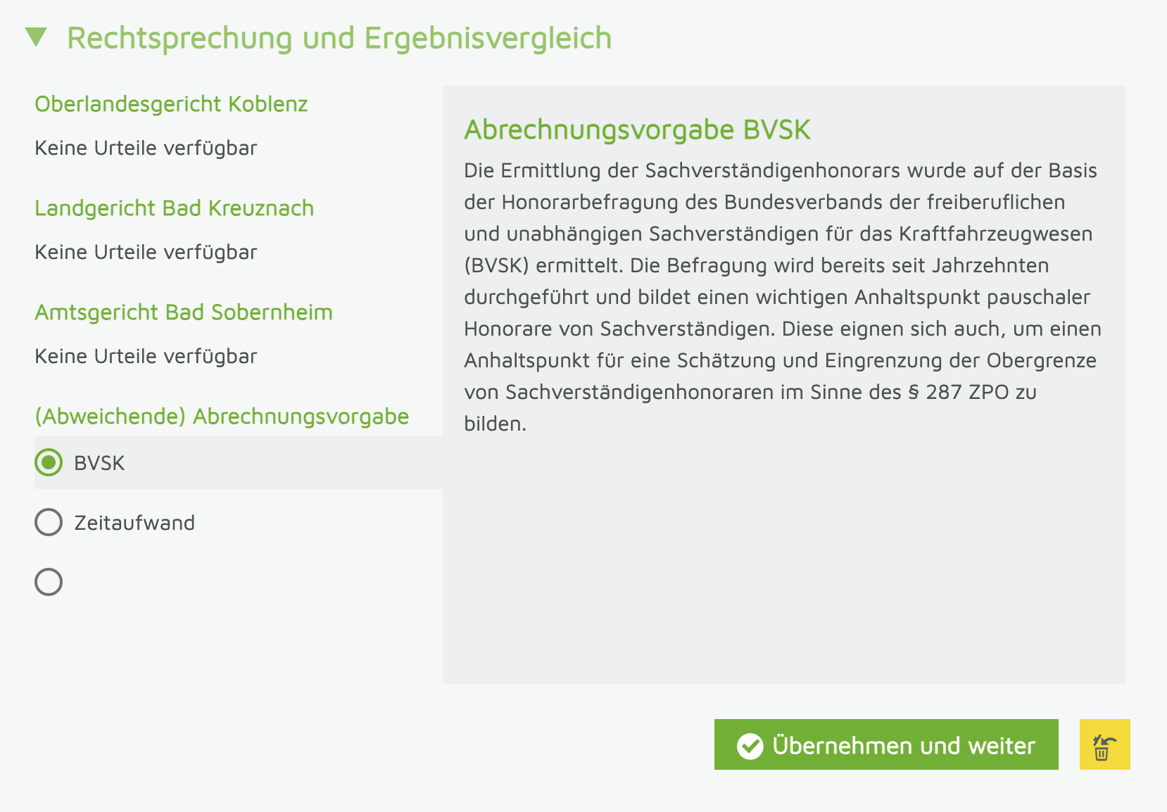 Zusätzlich wird bei vorhandener BVSK-Rechtsprechung systemseitig eine Urteilsauswahl angezeigt. Das vorgeschlagene Urteil wird im Prüfbericht vermerkt.