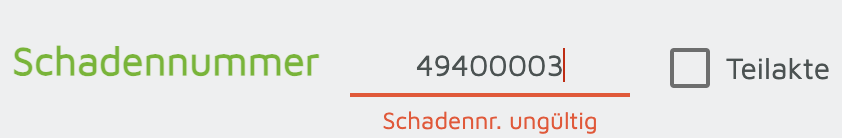 Die Teilakte wird genutzt, wenn unter einer Schadennummer mehrere Sachverständigen-Rechnungen geprüft werden müssen. Nach Eingabe der Schadennummer kann durch die Aktivierung des Kontrollkästchens „Teilakte“ im freien Eingabefeld eine Nummerierung oder Bezeichnung vorgenommen werden.