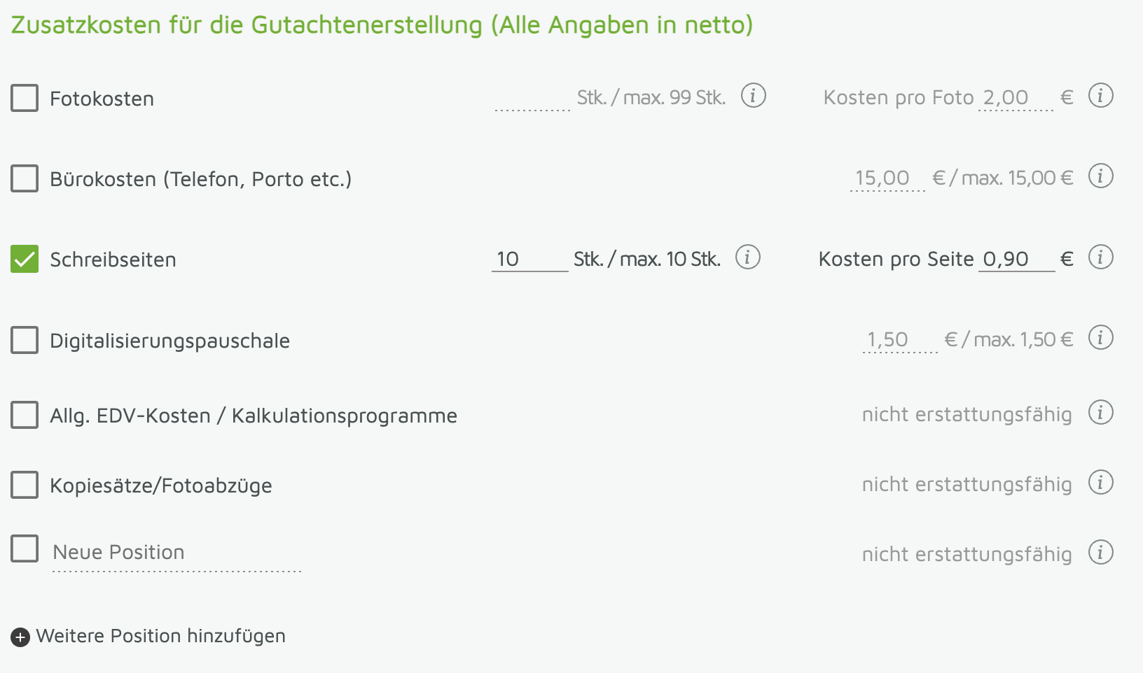 Es besteht die Möglichkeit, Kosten aus der Sachverständigenrechnung, die nicht erstattet werden sollen, einzutragen. Durch Betätigen des „+ Weitere Position hinzufügen“-Buttons können neue Positionen erstellt werden.