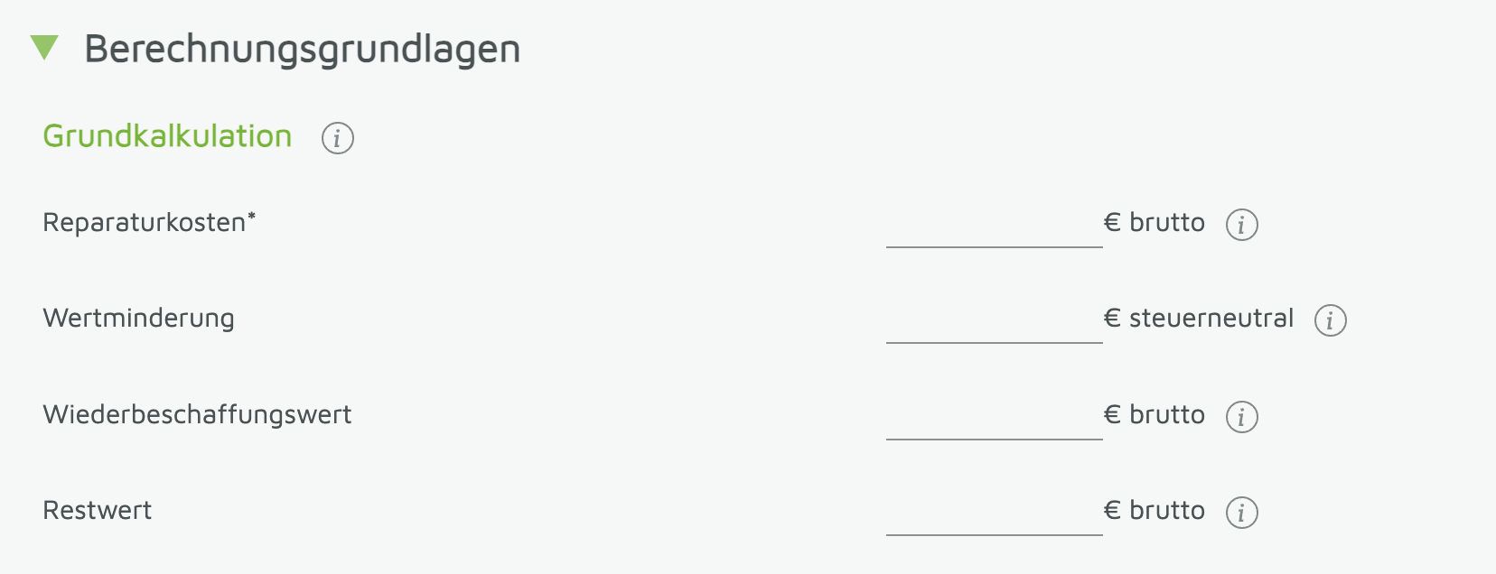 Das Feld „Reparaturkosten“ ist ein Pflichtfeld. Bei fehlenden Reparaturkosten (Totalschaden) ist die Zahl 99999 einzutragen. Die weiteren Eingabefelder der Grundkalkulation sind optional und werden nur entsprechend den Angaben im Gutachten ausgefüllt. Felder, die im Gutachten nicht enthalten sind, bleiben leer. Das Eingeben von „0“ in der Grundkalkulation ist nicht möglich.