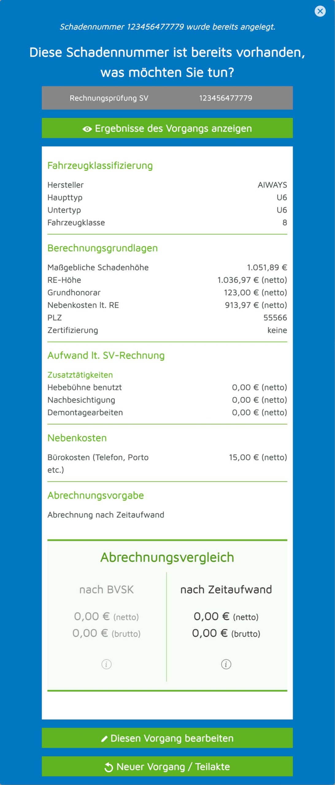 Wurde unter der eingegebenen Schadennummer bereits ein Fall bearbeitet und ein Prüfbericht gespeichert, erkennt das System die Schadennummer automatisch und zeigt ein entsprechendes Dialogfeld an. Wieder aufrufbar ist nur der zuletzt gespeicherte Stand unter der Schadennummer.