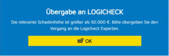 Anhand der bisherigen Eingaben berechnet HORCH die maßgebliche Schadenhöhe und zeigt sie in der Ergebnisleiste an. Liegt die Schadenhöhe über 50.000 € (netto), erscheint ein Popup-Fenster zur Fallübergabe an das LOGICHECK-Expertenteam. Diese Fallübergabe ist erforderlich, da bei einer hohen Schadenhöhe eine Prüfung durch einen LOGICHECK-Experten notwendig ist.