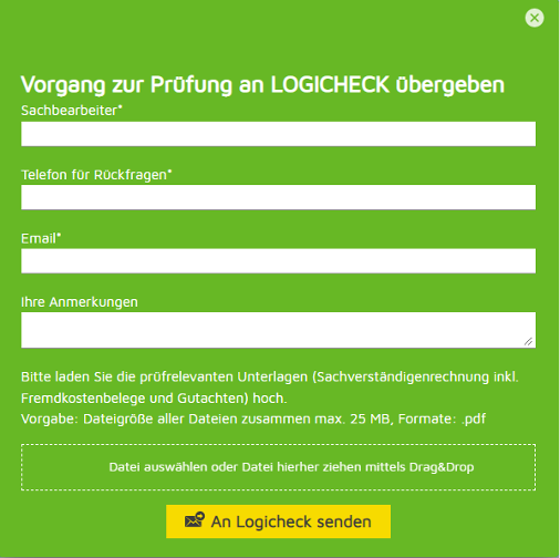 Sollte ein Kfz weder über die FIN noch über den Suchbaum gefunden werden, besteht die Möglichkeit, die Prüfung per E-Mail an das LOGICHECK-Expertenteam zu übergeben. Das Gleiche gilt, wenn Probleme oder Unsicherheiten während der Prüfung auftreten. In solchen Fällen übermitteln Sie bitte das vollständige Gutachten inklusive SV-Rechnung und eventueller Fremdrechnungen. Sobald alle Unterlagen vorliegen, kann der Vorgang geprüft und der Prüfbericht an die Schadenakte gesendet werden.