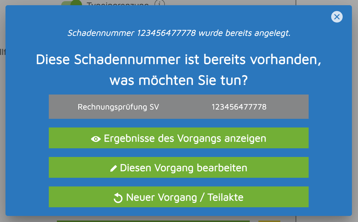 Falls versehentlich eine falsche Schadennummer eingegeben wurde, ermöglicht der Button „Neuer Vorgang / Teilakte“ die Eingabe einer neuen Schadennummer oder die Eröffnung einer Teilakte unter der bereits vorhandenen Schadennummer.