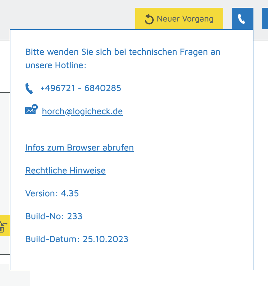 Unter dem Button „Hotline“ rechts oben finden Sie Angaben zu