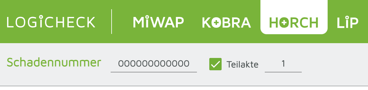 Die Bearbeitung eines Falls ist erst nach Eingabe einer eindeutigen Schadennummer möglich. Gespeicherte Schadennummern können zeitlich unbegrenzt erneut aufgerufen und bei Bedarf bearbeitet werden. Das Eingabefeld für die Schadennummer ist an eine kundenindividuelle Logik angepasst – systemseitig wird überprüft, ob die Eingabe zulässig ist und dieser Logik entspricht.