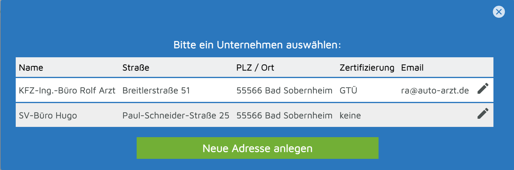 Unter „Gutachter“ erscheint nach Eingabe der Postleitzahl eine Liste an Auswahlmöglichkeiten von Sachverständigenbüros im entsprechenden Postleitzahlgebiet.