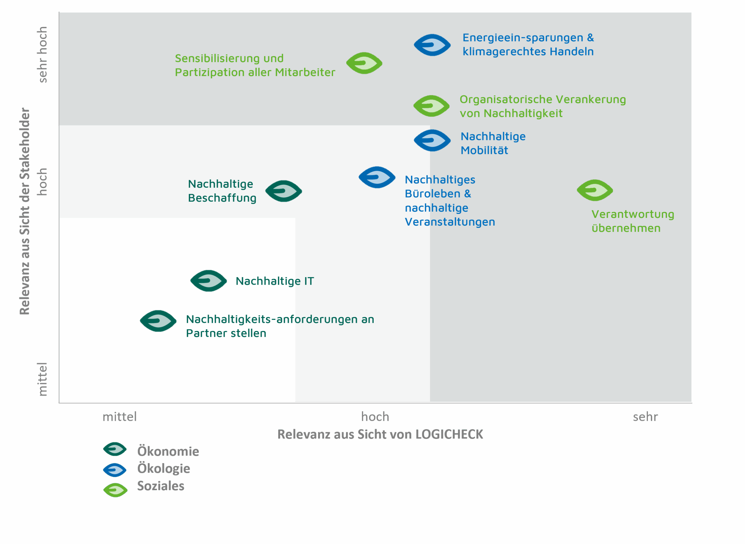 Die drei Blätter in unserem Logo stehen für die Geschlossenheit aller Bereiche und Abteilungen bei LOGICHECK im Hinblick auf Nachhaltigkeit. Darüber hinaus nehmen die drei Blätter nicht nur die Form einer Weltkugel an, sondern erinnern auch an das Recyclingzeichen. Dies unterstreicht unser Engagement für eine nachhaltige Kreislaufwirtschaft und verdeutlicht, dass wir nicht nur auf lokale, sondern auch auf globale Verantwortung setzen. Ihre Anordnung und Gestalt machen zudem sichtbar, dass alle Elemente unserer Nachhaltigkeitsstrategie – Ökologie, Soziales und Ökonomie – eng miteinander verbunden sind und nur im Zusammenspiel ihre volle Wirkung entfalten. Für die Umsetzung der Nachhaltigkeitsstrategie haben wir für jede strategische Stoßrichtung spezifische Ziele und Kennzahlen formuliert. Das daraus resultierende Nachhaltigkeitsprogramm beinhaltet Querschnittsaufgaben für alle Unternehmensbereiche und wird jährlich überprüft und gegebenenfalls überarbeitet. Damit integrieren wir den Nachhaltigkeitsgedanken in alle Geschäftsprozesse. Anhand der Ziele steuern wir im Nachhaltigkeitsmanagement unsere Aktivitäten und überprüfen die Erfolge.