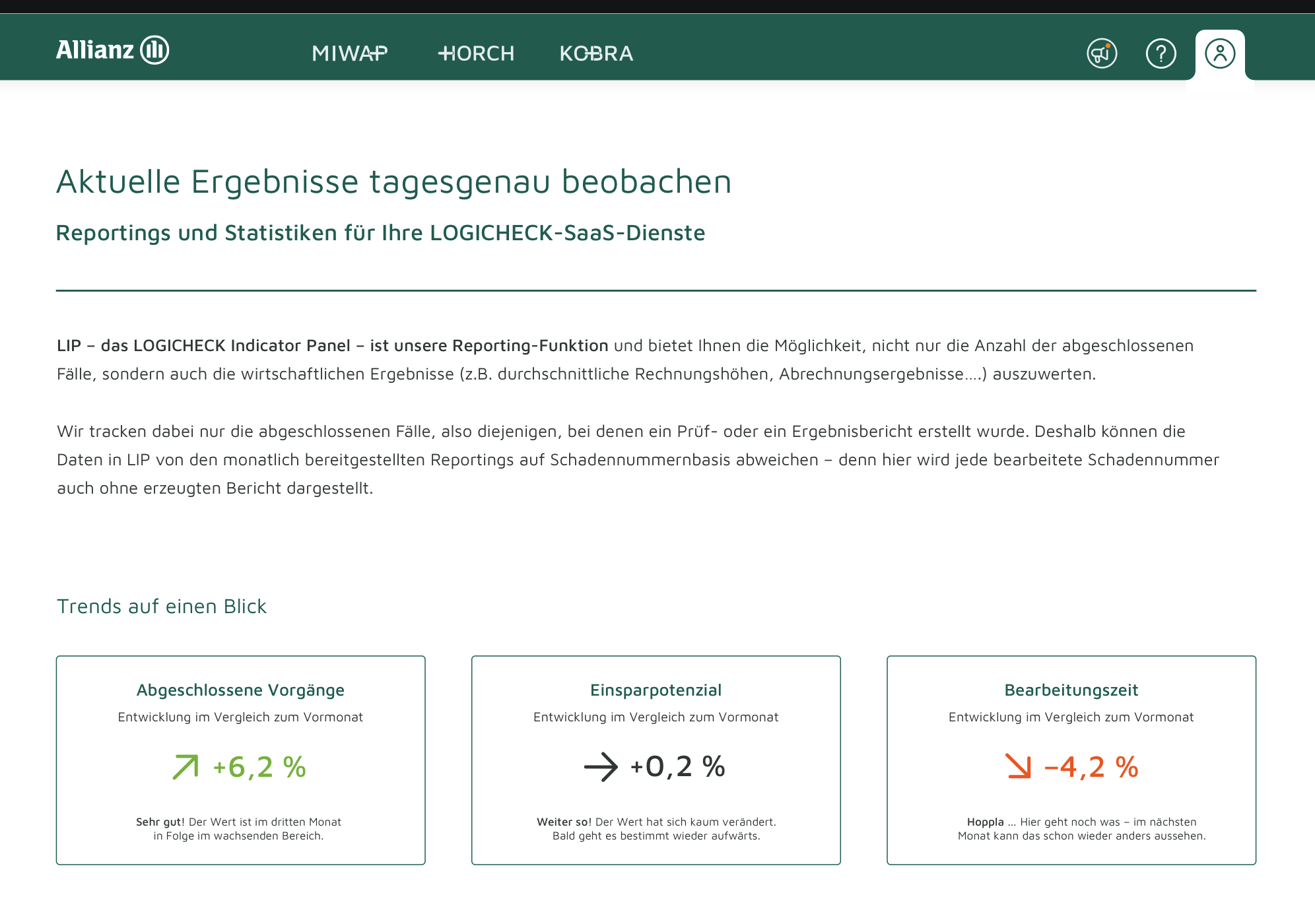 Nach dem Einstieg (Seitenaufbau ähnlich der MIWAP-Startseite) zeigen drei Kacheln erste Trends auf einen Blick. Diese sollen dem Nutzer kurz und prägnant aktuelle Entwicklungen über eher allgemeine Insights zeigen.