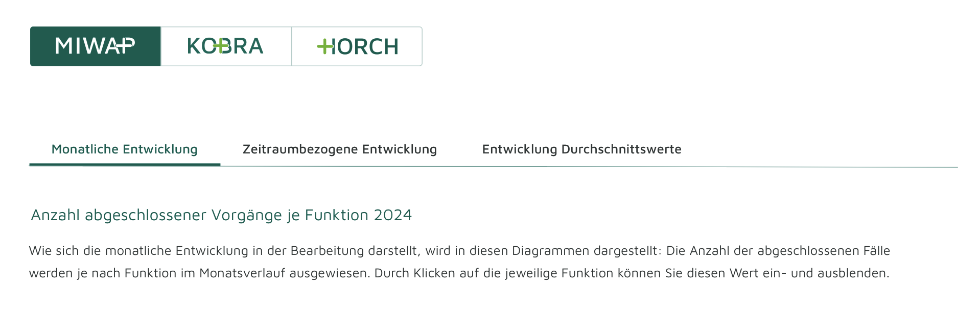 Für jeden Dienst stehen dann drei Statisitk-Kategorien zur Verfügung: Monatliche Entwicklung, zeitraumbezogene Entwicklung und Entwicklung der Durchschnittswerte.