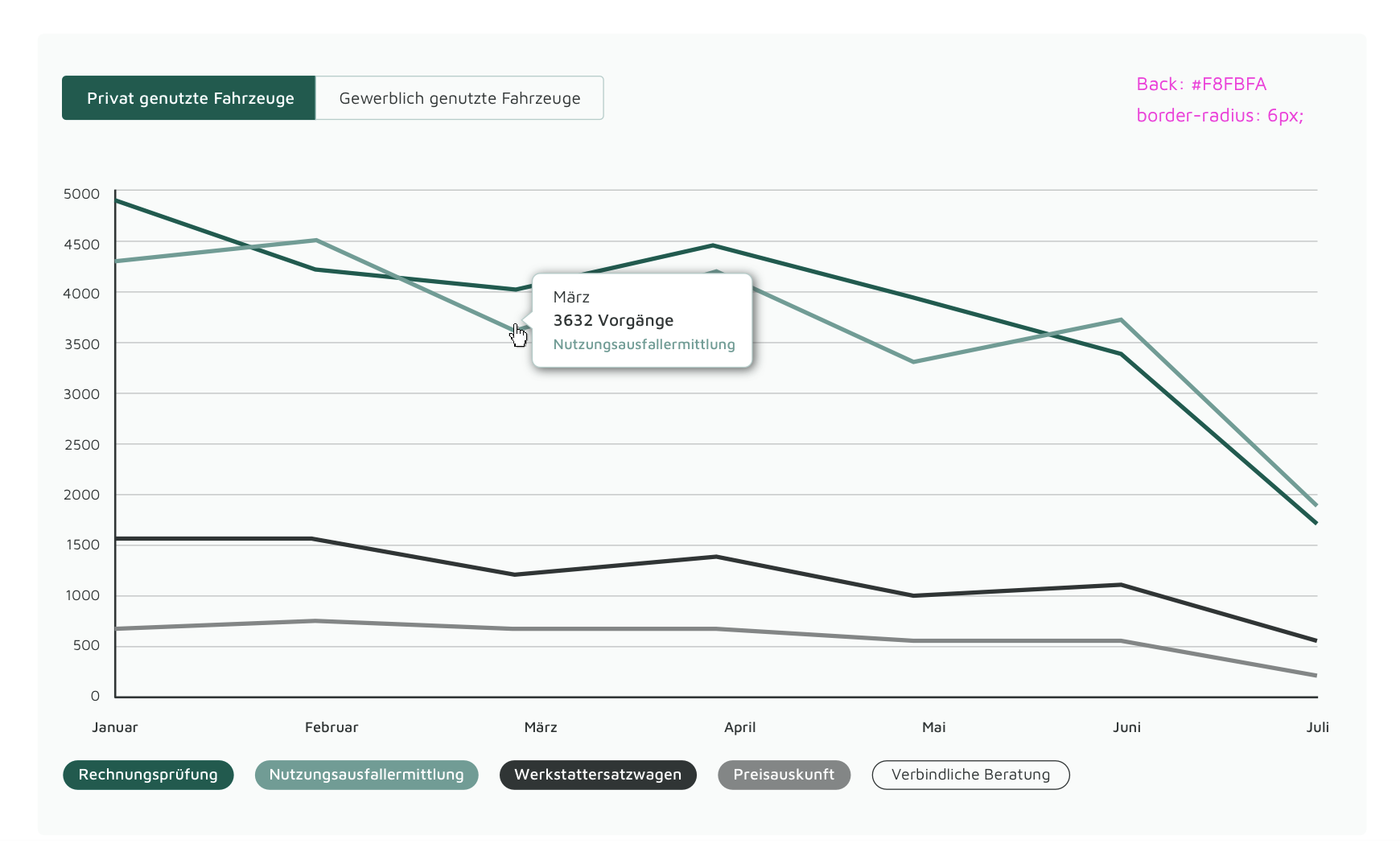 Werden in einem Diagramm Zahlen abgebildet (etwa die Entwicklung von Vorgängen), wird ein Liniendiagramm eingesetzt. Bei Mouse-Over über einen Wert werden die entsprechenden Werte angezeigt. Die Optik der Tooltips richtet sich nach der bekannten Formatierung von Tooltips.