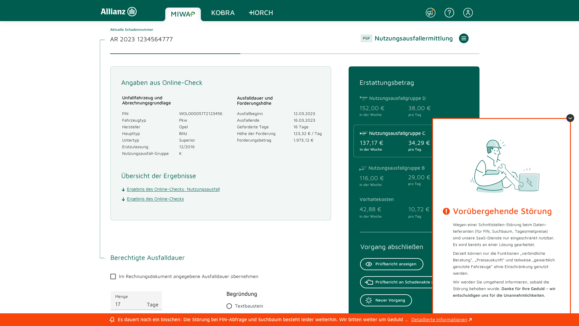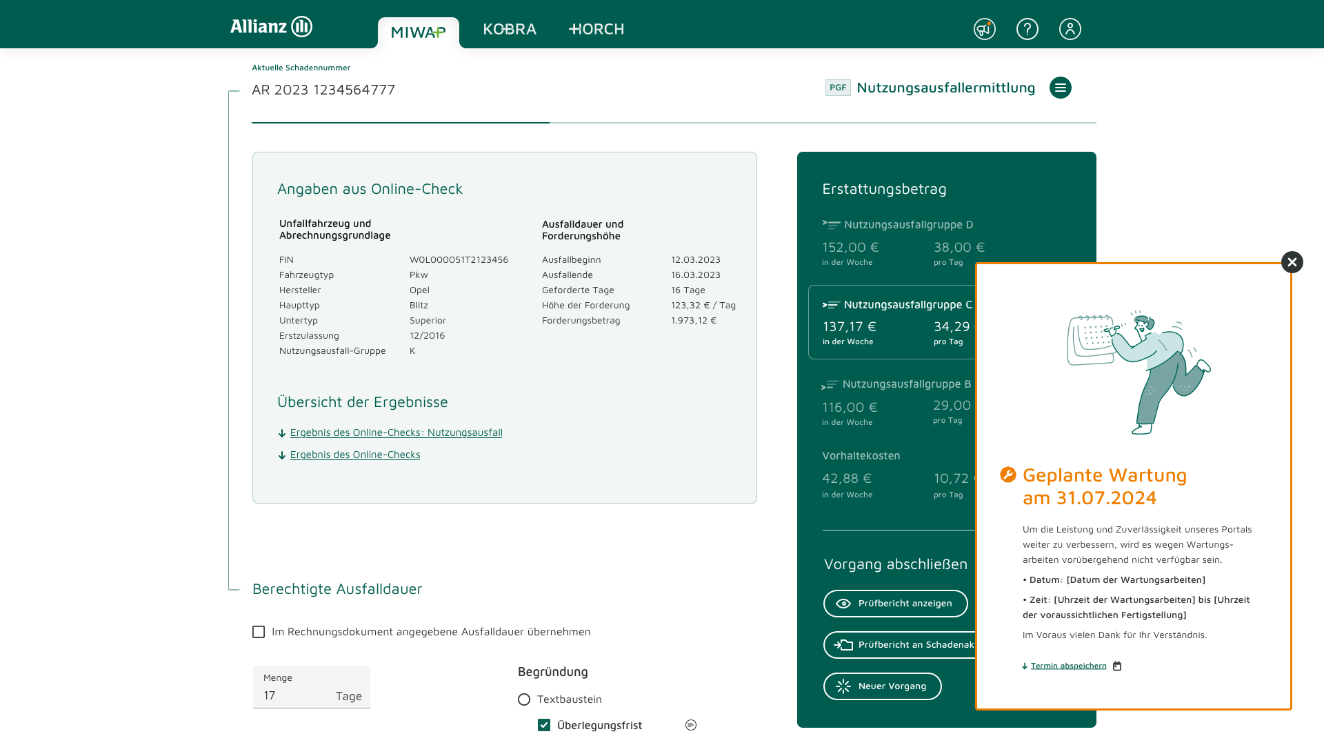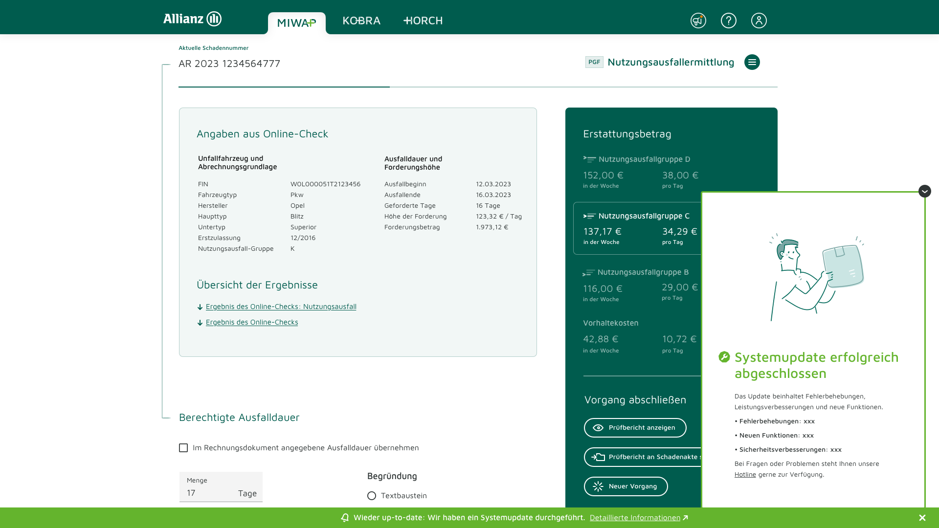 Unter Neuigkeiten fallen neben Grußmeldungen wie etwa zu Weihnachten auch Neuerungen eher beiläufiger Art, wie etwa die Umstellung des Automietpreisspiegels. Diese werden im Flyout „Neuigkeiten“ in der Navigationsleiste ausgespielt. Ankündigungen von Wartungsarbeiten erfolgen in einem Info-Fenster rechts unten über dem Seiteninhalt. Wichtige Systemmeldungen (z.B. Ausfall der FIN-Abfrage) werden in einer am unteren Browserrand gefixten Leiste ausgespielt. Die eben genannten Info-Fenster können auch weitere Details zu in der Leiste erwähnten Ereignissen enthalten.