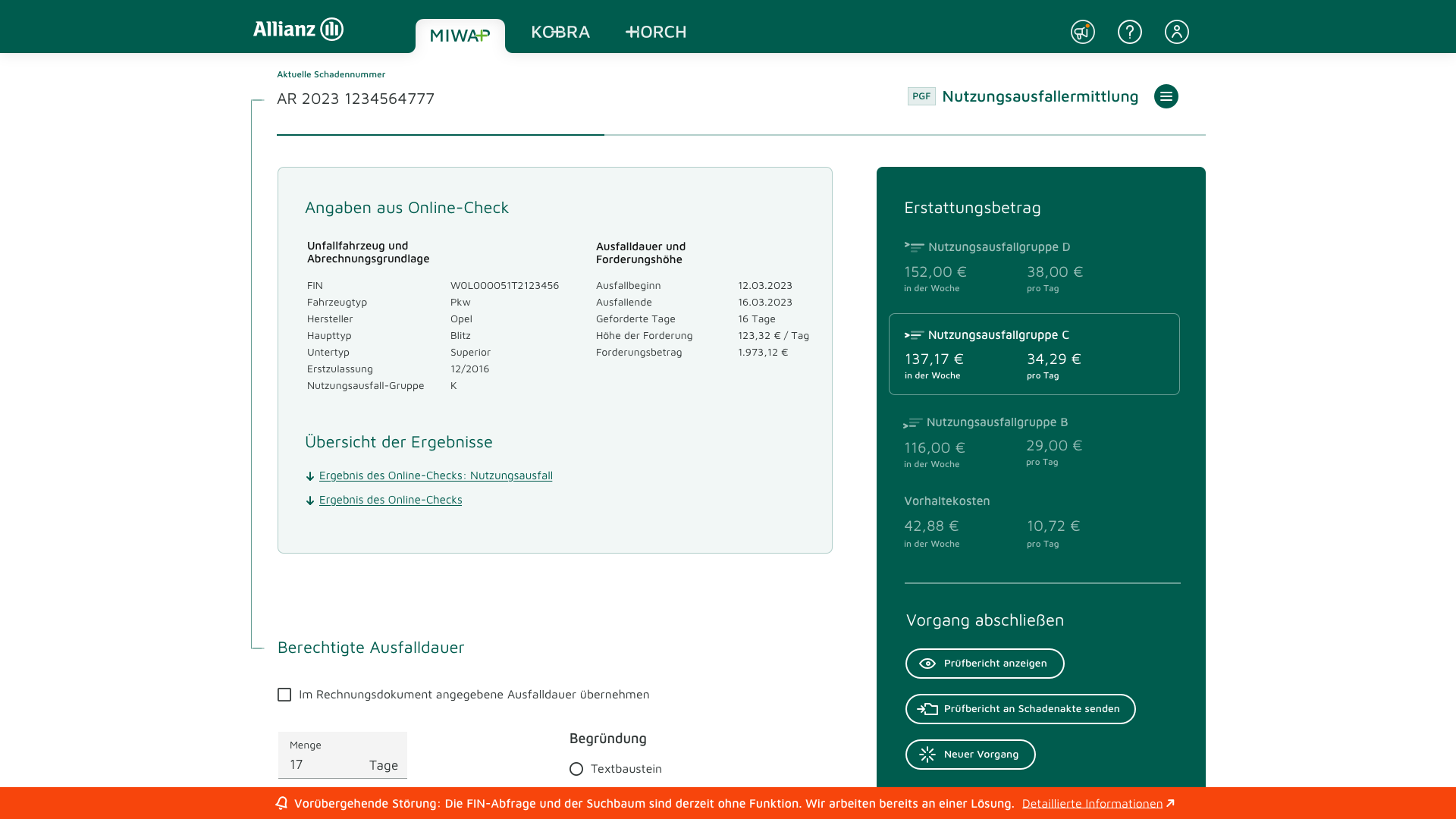 Gibt der Benutzer eine Schadennummer ein, die bereits vorhanden ist, wird das System eine Liste mit den zugeordneten Vorgängen anzeigen. In der Liste werden diese Informationen angezeigt: Angewendete Funktion, Nummer der Teilakte (falls vorhanden), Datum der letzten Bearbeitung, Status der Bearbeitung (Abschluss in Prozent, komplett abgeschlossen oder Reklamation). Eine Zeile wird mit den Funktionen „Anschauen“, „Bearbeiten“ und „Reklamation angelegen“ (möglich, sobald der Vorgang komplett abgeschlossen ist) beendet.