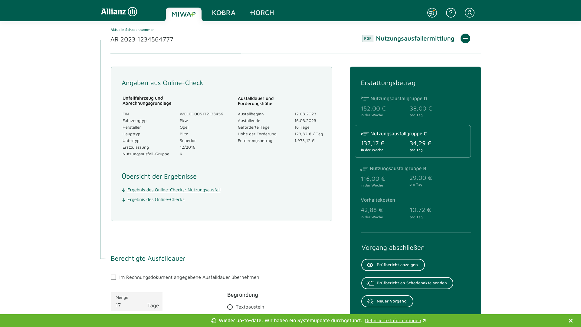 Bei abgeschlossenen Fällen kann so eine Reklamation ausgelöst werden. Dabei wird der Vorgang dupliziert. In der Funktion werden korrigierte Werte in der Ergebnisbox angezeigt.
