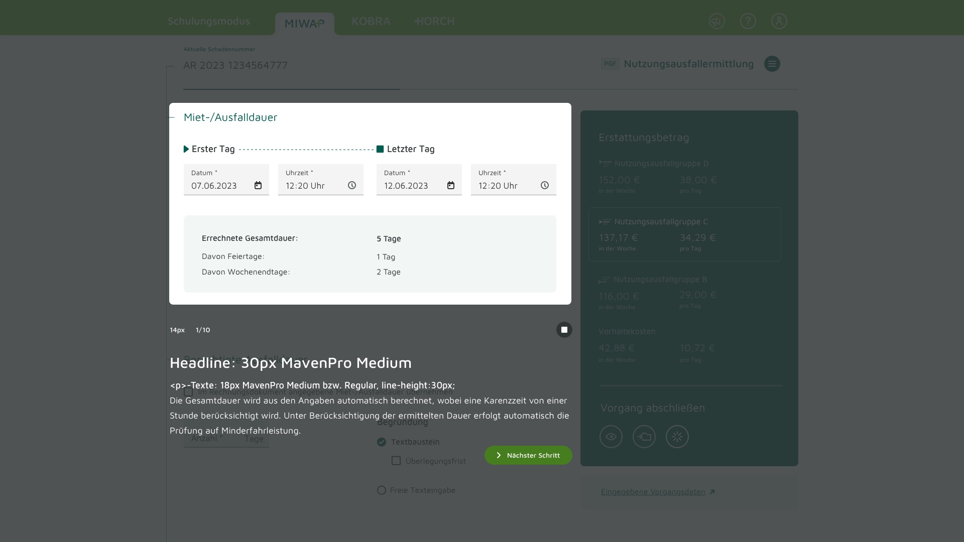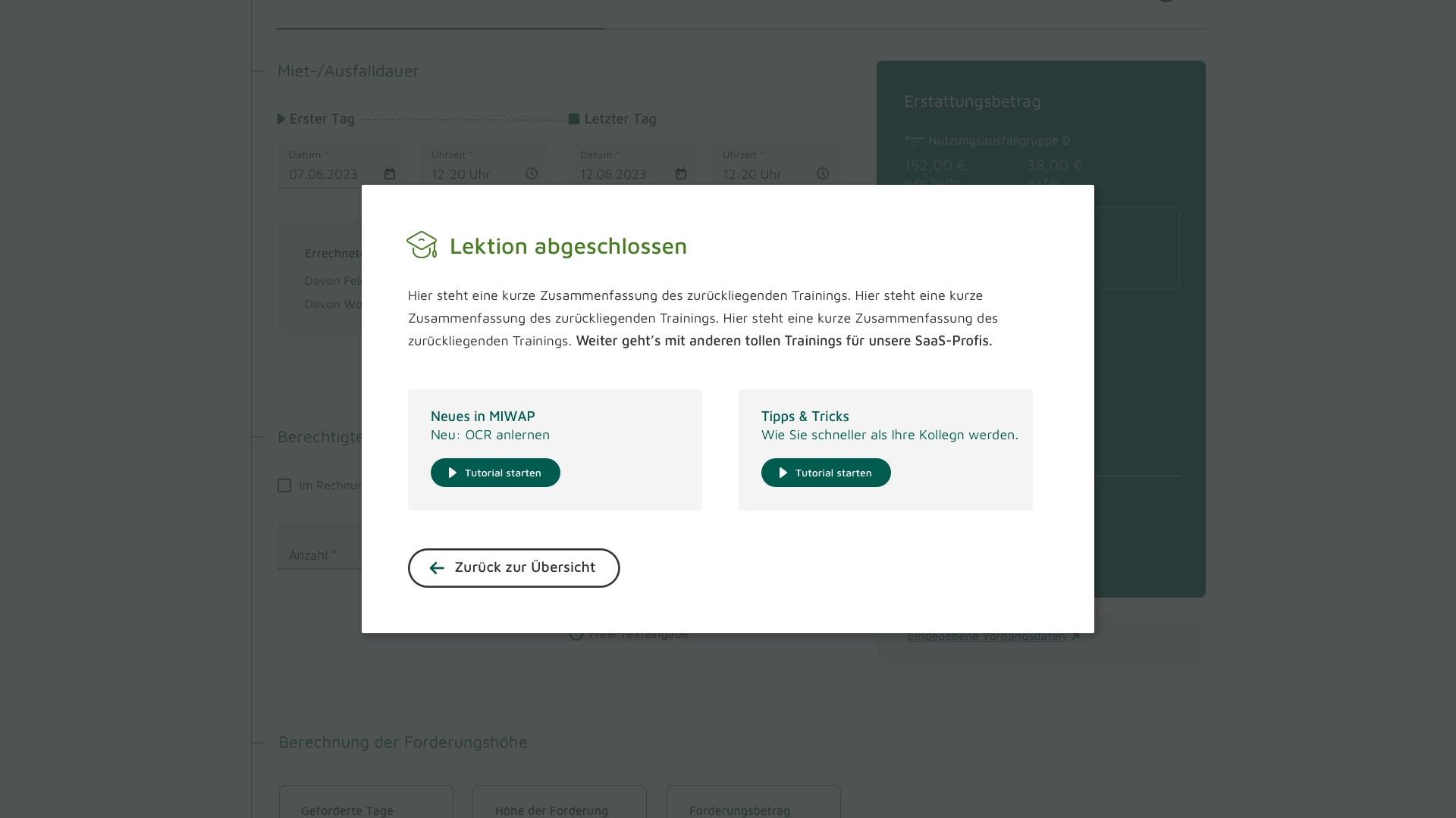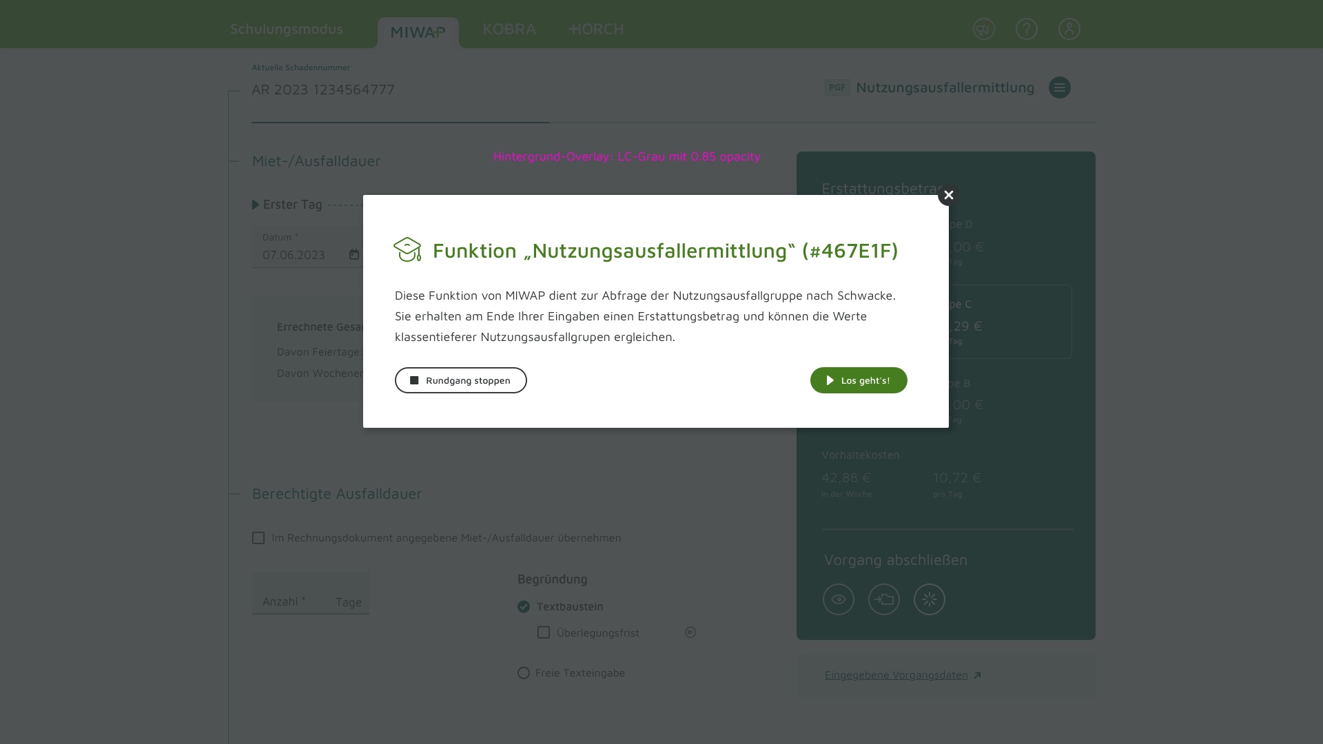 Die Anleitung findet in einer speziellen Umgebung statt: Hier wird das Kundenlogo durch den Begriff „Schulungsmodus“ ersetzt. Außerdem wird die Farbe „LC Petrol“ durch die abgedunkelte Variante von LC-Grün (#467E1F) ersetzt (im Header der Anwendung und bei den Buttons der Popups). Damit soll optisch auch klargemacht werden, dass es sich nicht um die Live-Anwendung handelt.